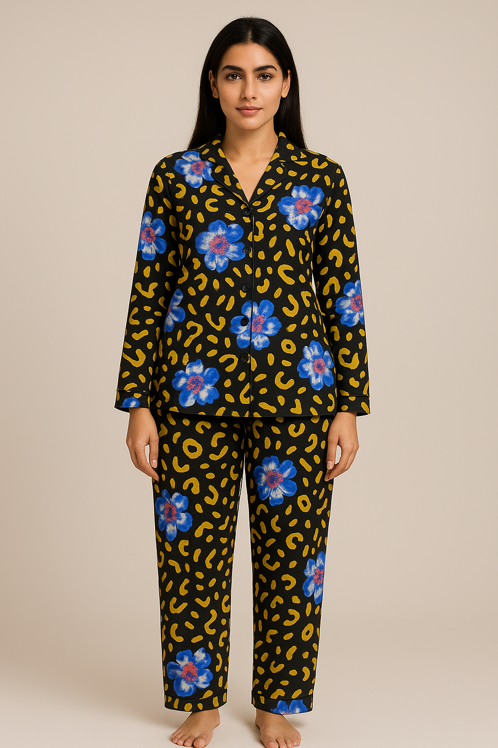 Unleash your wild side with our floral cheeta Print Pajama Set the perfect blend of bold style and breezy comfort. Crafted from a lightweight, breathable linen-blend fabric, this two-piece set includes a relaxed short-sleeve button-up top with a chest pocket and matching drawstring shorts. The eye-catching black-and-white zebra print adds a playful yet chic touch, making it ideal for warm nights or laid-back lounging.