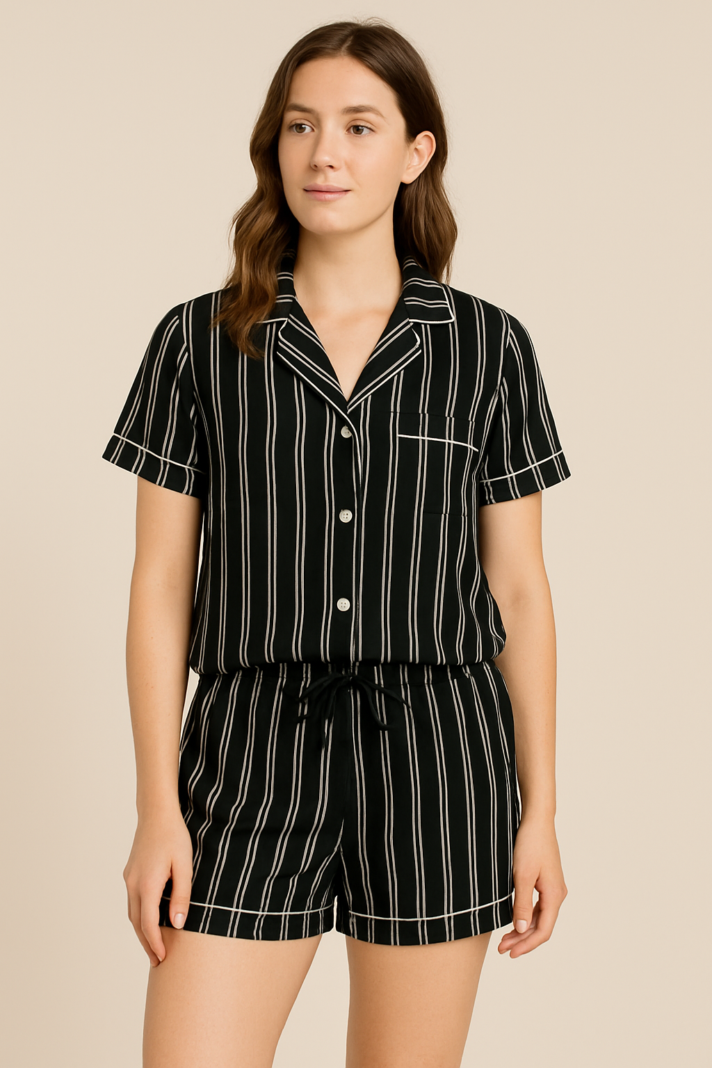 Keep it classic and comfy with our Black Striped Short Pajama Set. Designed with a timeless vertical stripe pattern, this two-piece set features a lightweight button-up shirt with a notched collar and chest pocket, paired with coordinating shorts with a comfy elastic waistband and drawstring. Made from a breathable, soft-touch fabric, it’s perfect for warm nights, weekend lounging, or relaxed mornings.